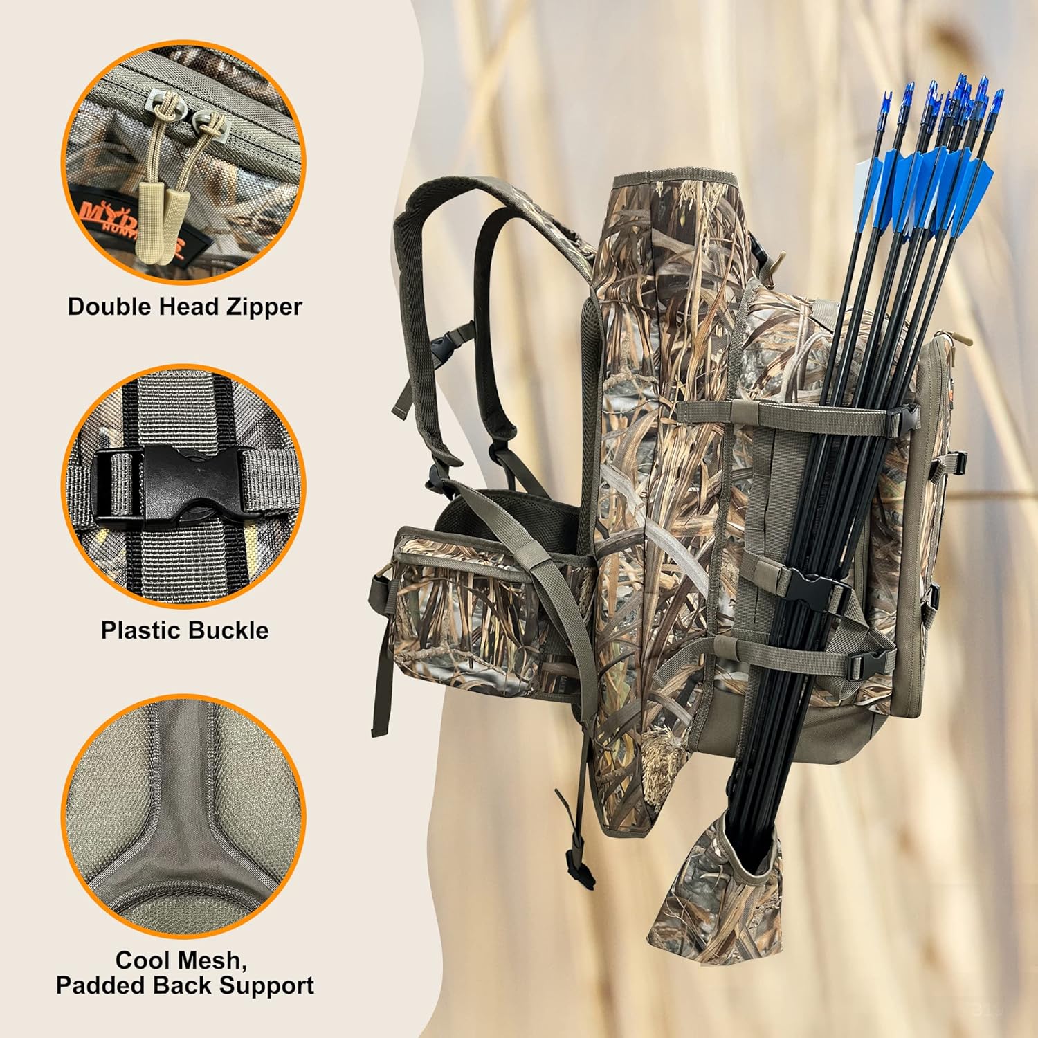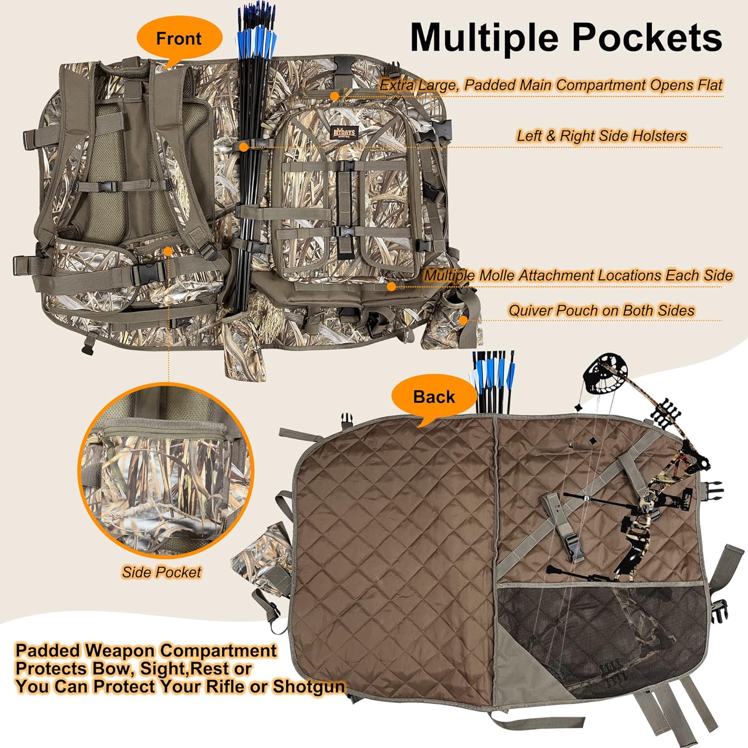 • 【Large Capacity】Multiple compartments which categorizes items of different categories.Organizational pocket inside of main compartment and side pockets to keep your gear organized.Two small quivers on the sides of the backpack.Padded weapon compartment will protecs bow, sight, rest, rifle or shotgun.